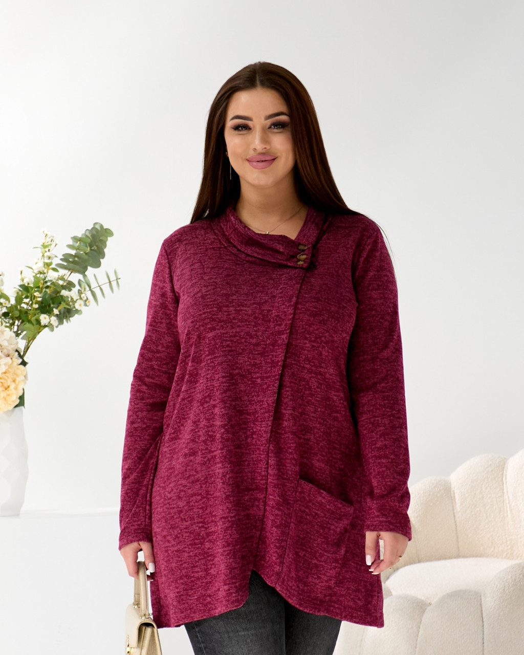 Модель має вільний фасон, який красиво драпірується й візуально струнить фігуру. Асиметричний крій і декоративні ґудзики біля коміра додають вишуканості, а практична одна накладна кишеня робить туніку зручною для щоденного носіння.